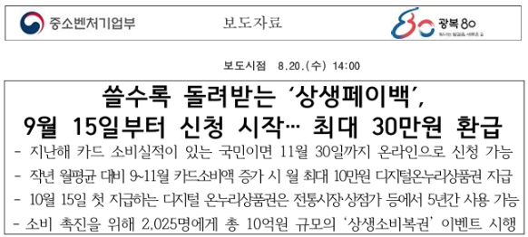 - 공식 정보 기준: 중소벤처기업부 보도자료(2025.08.20.) 및 상생페이백 누리집 공지.