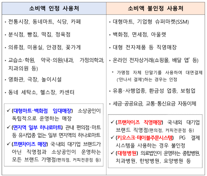 ❌ 불인정: 대형마트/SSM, 백화점/면세/아울렛, 대형 전자제품 직영, 온라인 쇼핑·배달앱, 키오스크/테이블오더(판매자 확인 불가), 유흥·사행, 세금·보험료, 교통·통신요금 자동이체 등